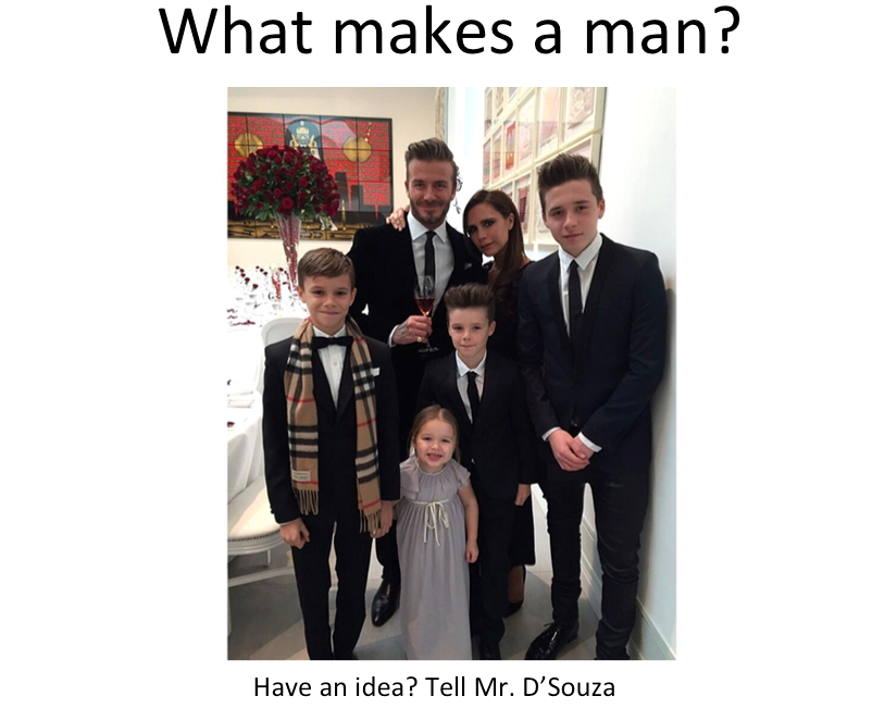 But anyway – during the week before my assembly, I put up posters of distinctive men (David Beckham, Barack Obama, Sonny Bill Williams, Jay Z etc.) with a simple question above each picture: ‘What does it mean to be a man?’ The call to action underneath was ‘if you have an answer, tell Mr. D’Souza.