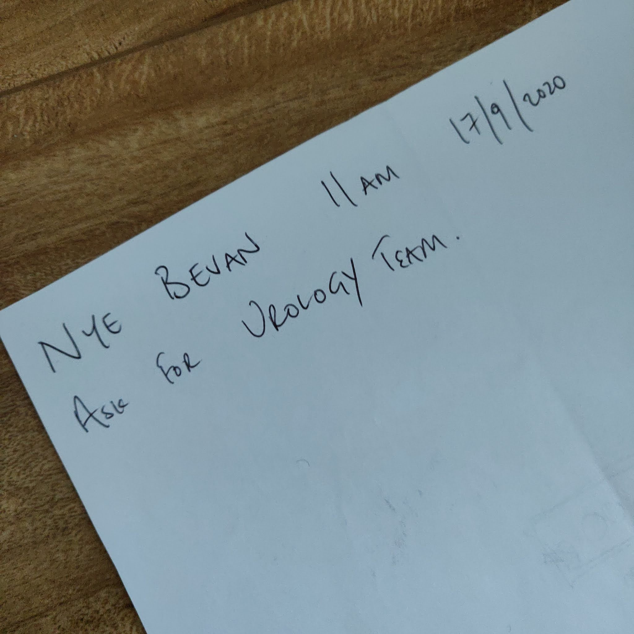 Thursday 17 September, 2020, 10:45am, I arrived at the urology department of St George’s Hospital. With my mask on. I’d got used to breathing through my nose in my mask. As an asthmatic, it wasn’t always natural. Nothing like necessity to force change.